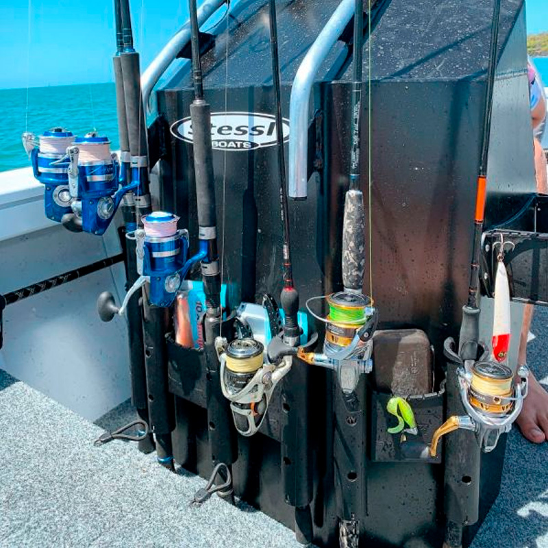 Il montaggio sfalsato è possibile, offrendoti una soluzione per riporre bobine più grandi, senza che si urtino tra loro. Il portacanna verticale RodStow è adatto per la maggior parte delle canne e dei mulinelli, inclusi mulinelli da spinning, trigger, barca e gioco e qualsiasi lunghezza di canna da pesca.