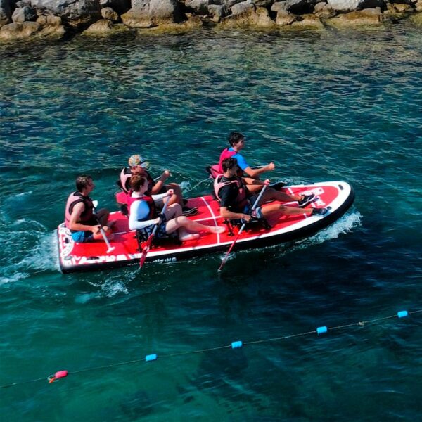 E’ dotato di 4 sedili reclinabili che consentono l’imbarco di 4 persone nel massimo comfort, la coperta è interamente rivestita in schiuma EVA. È possibile attaccare 2 pinne sul retro della tavola, pinne fornite.